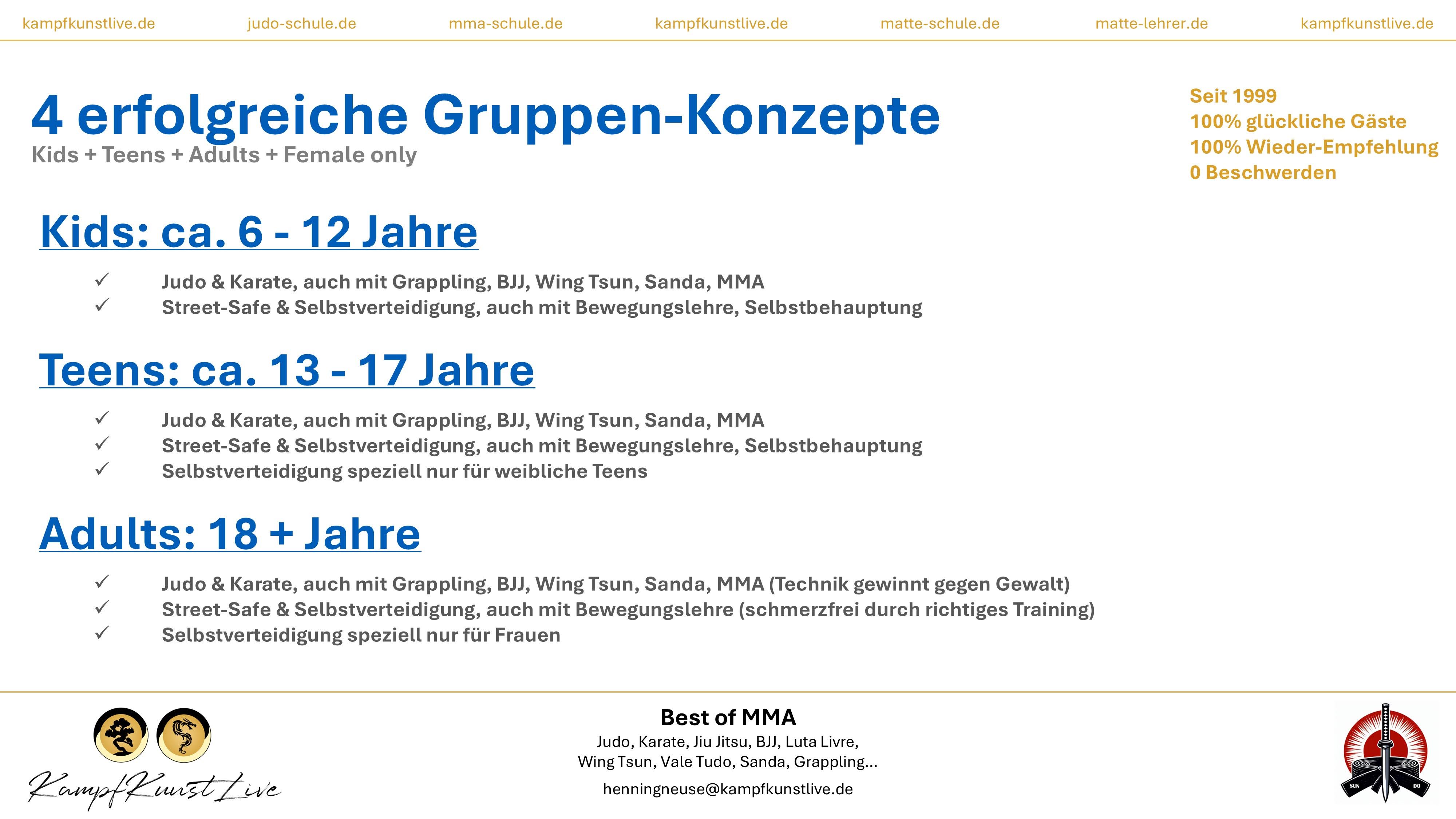 Adults-only-Camps teilnehmen, um Kampfstile einfach einmal auszuprobieren, beweglicher und mobiler, stärker und schneller und schmerzfrei zu werden...