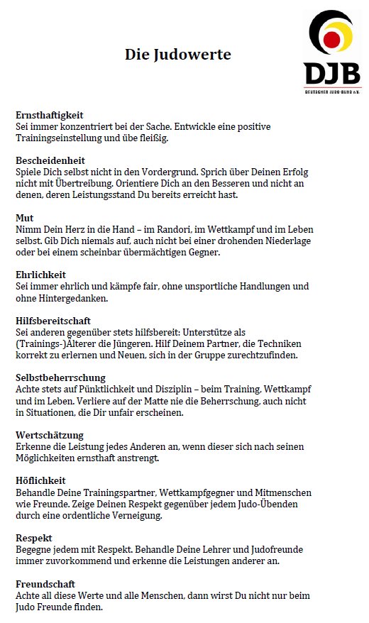 Ziel ist es, diese Prinzipien als eine Haltung in sich zu tragen und auf der Judomatte (jap. Tatami) bewusst in jeder Bewegung zum Ausdruck zu bringen.